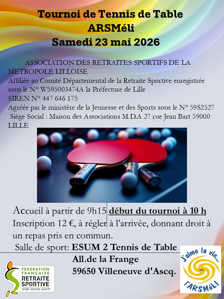 Tournoi Interclubs 6 clubs en compétition AMICALE Nous invitons 5 clubs à participer à notre tournoi: L'amicale Pongiste retraite sportive de Lille , le SARS (saint Remy du Nord), le LARS (saint AMAND), le MARS (LOUVIGNIES-QUESNOY) et Loisirs et détentes (WANDIGNIES-HAMAGES) Nous organisons le repas du Midi, par un apéritif et un picnic, pour une participation de 12€ par personne. Tous nos adhérents seront les bienvenus pour le repas suivant la participation bien entendu.